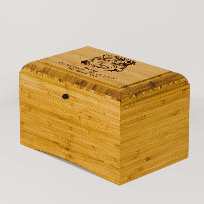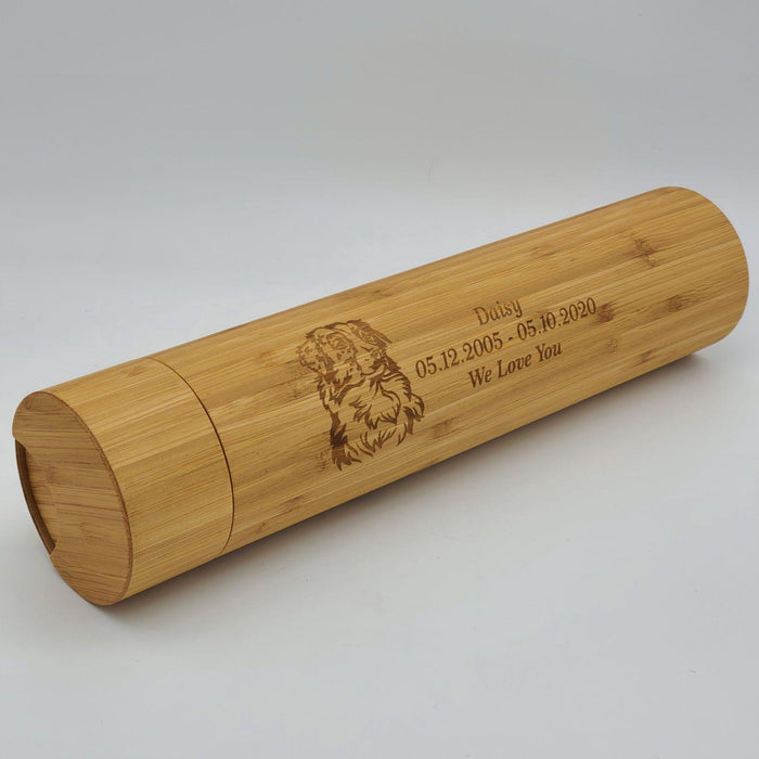 This version of the Eco Water Urn comes packaged in a sleek bamboo casing with an engraved standard australian shepherd portrait, your australian shepherd's name, date of birth and passing, and a sentiment of choice.