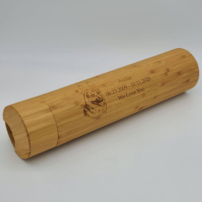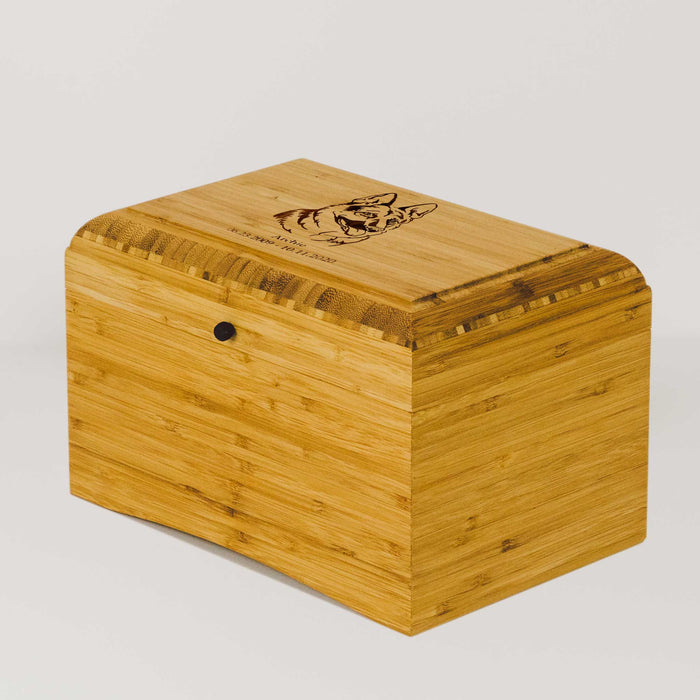 This version of the Eco Water Urn comes packaged in a sleek bamboo casing with an engraved standard german shepherd portrait, your german shepherd's name, date of birth and passing, and a sentiment of choice.